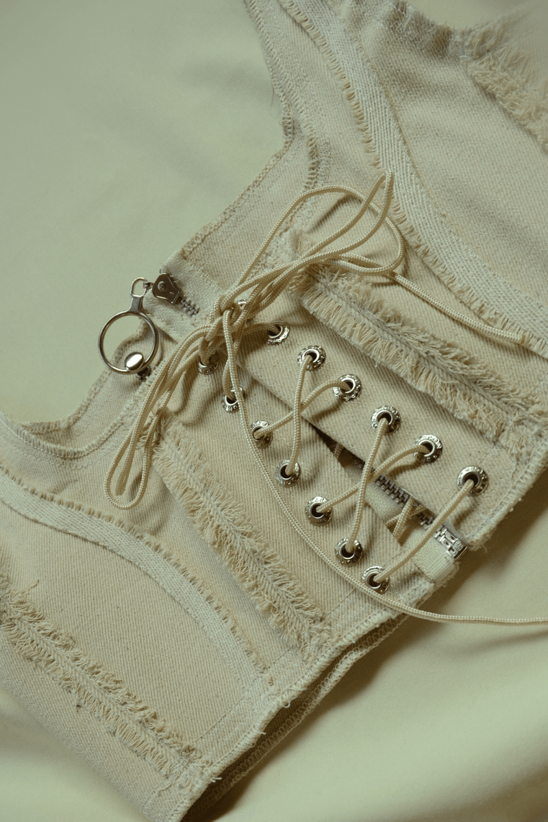 Top con varillas, cierre de cremallera, cordondes en delantero y desgastes hechos a mano