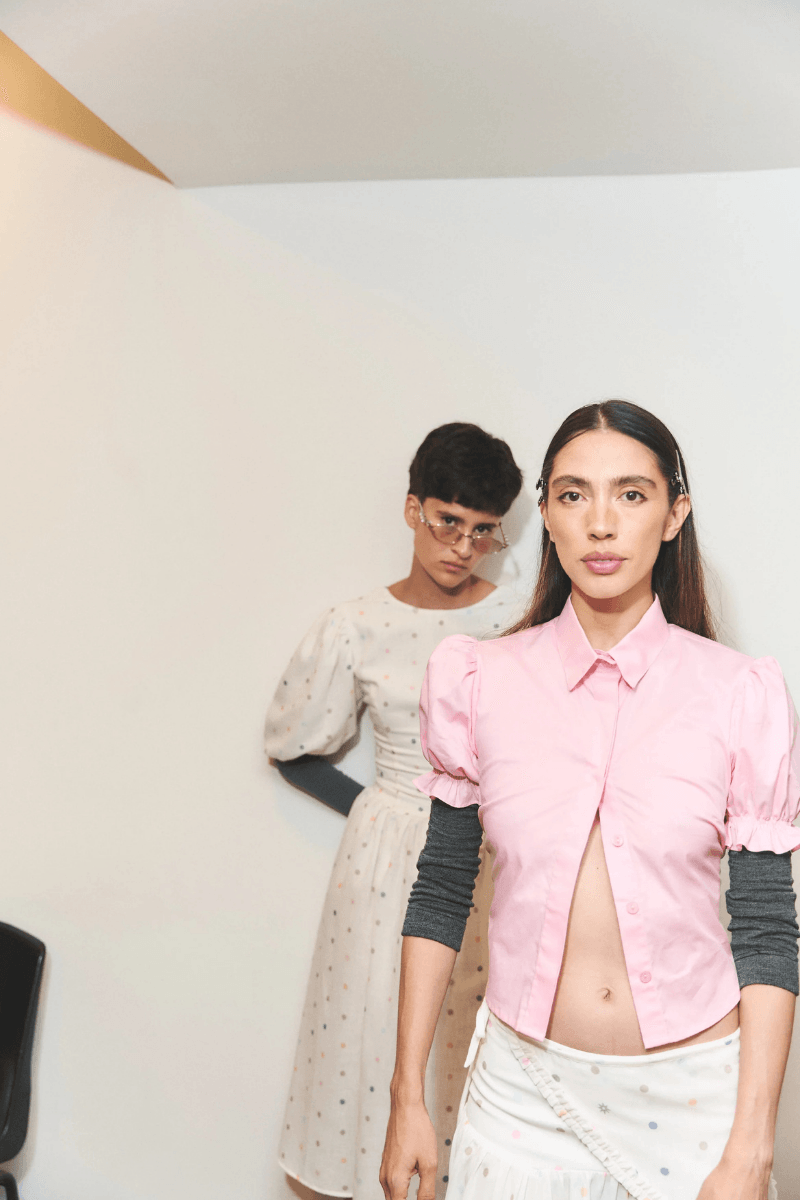 Camisa en algodón color rosa u oliva, de silueta básica con cuello camisero y mangas abombadas. Cuenta con abertura frontal de botones y detalle posterior con tiras para anudar, permitiendo ajustar la cintura. Diseñado y confeccionado en Colombia.