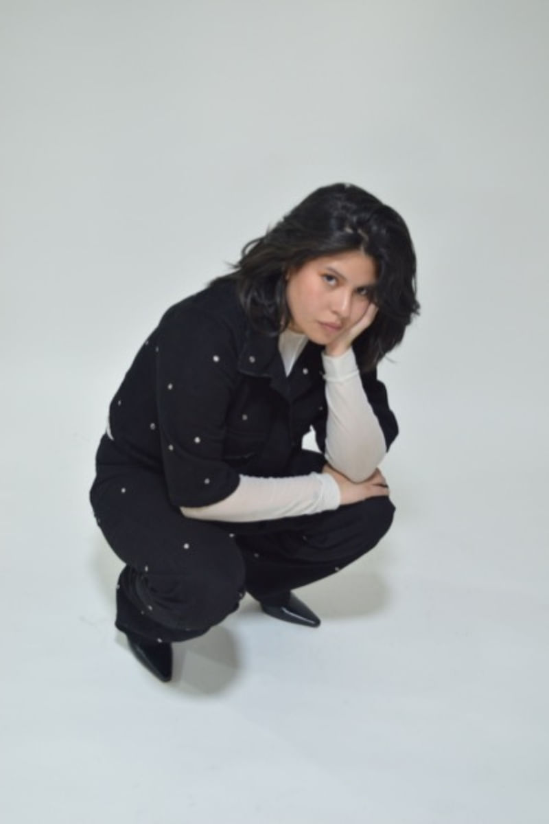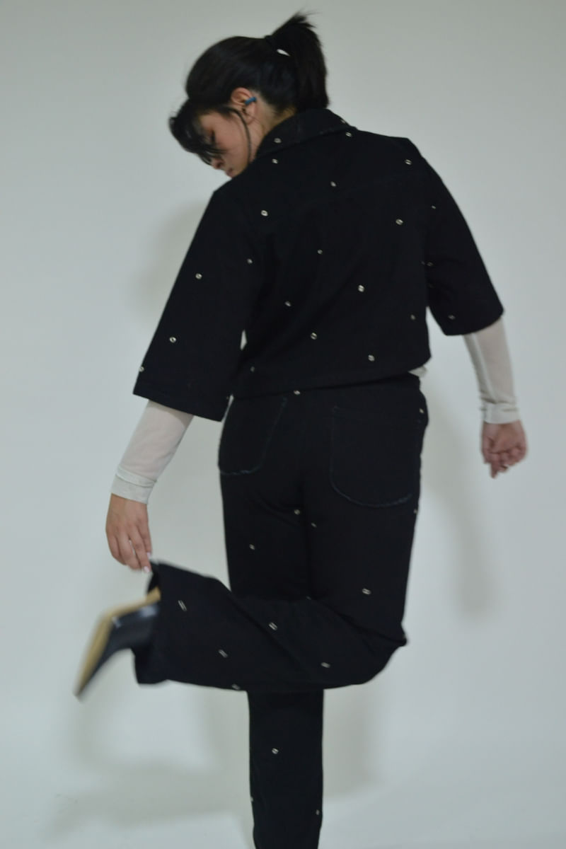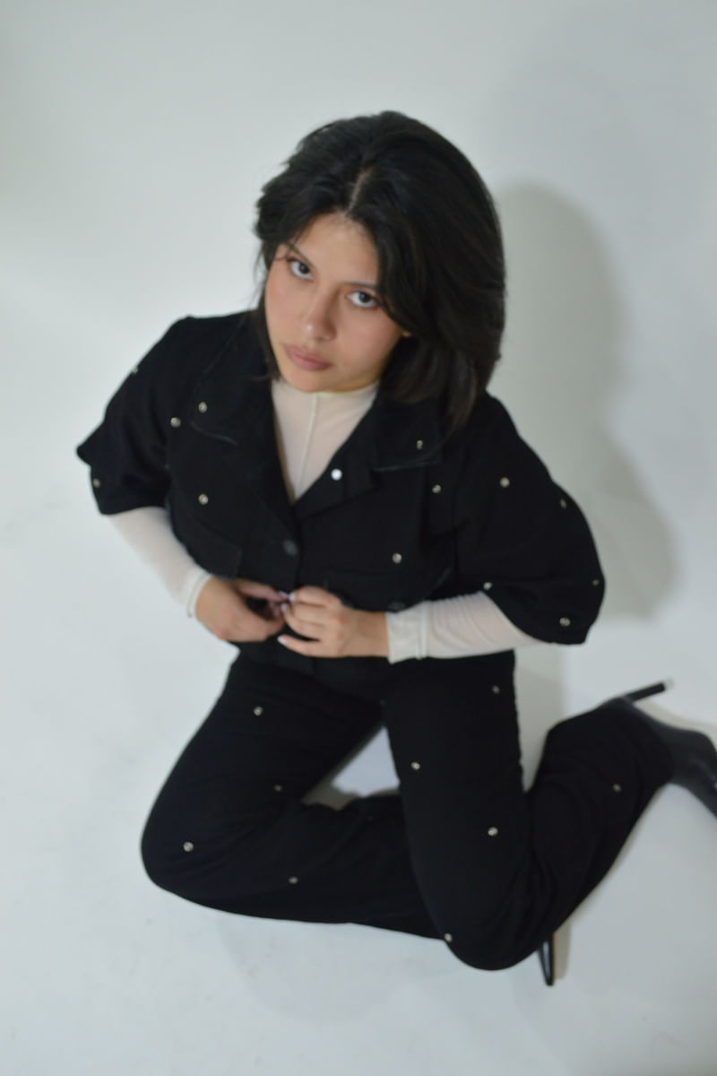 Chaqueta negra con ojaletes por toda la prenda, corte a la altura de la cintura con bolsillos delanteros desflecados.