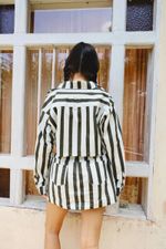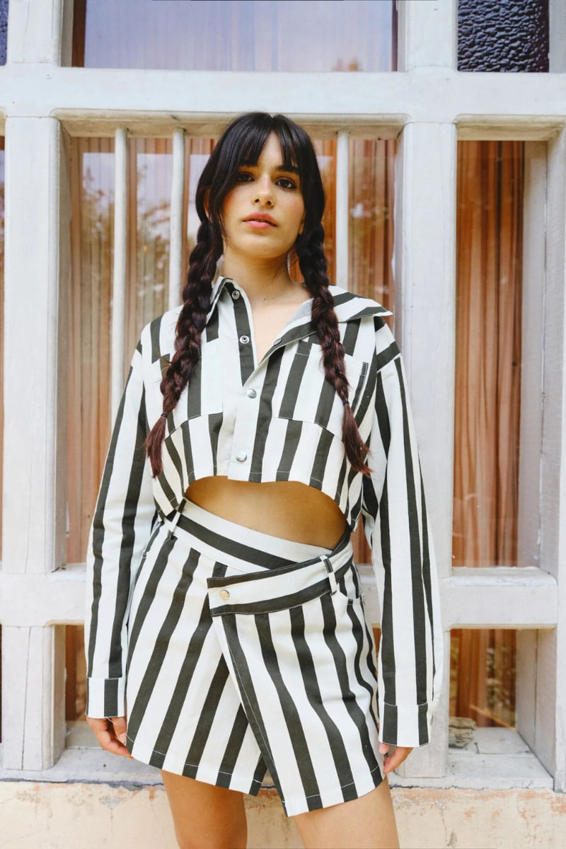 Mini jacket de manga larga y fit oversized con cuello abierto y cierre con botones a presión. El diseño de esta pieza tiene hombros caídos y dos bolsillos frontales.