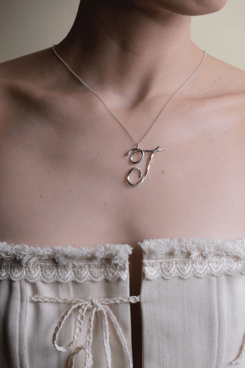 Collar con iniciales hechas en plata ley 950 entorchadas. Inicial de 3 cms de largo. Con cadena y terminaciones hechas en plata ley 925, largo de la cadena de 45 cms más 5 cms de cadena de extensión.