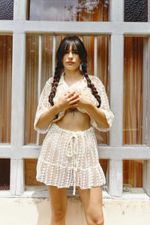 Mini falda con efecto boleto y cordón de ajuste en el mismo material que le permite adaptarse a cualquier medida.