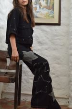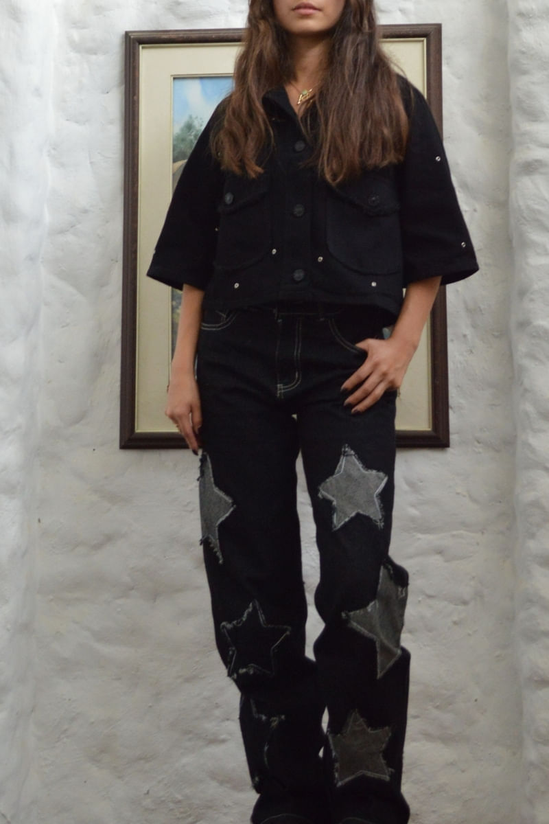 Jean en algodón negro con parches de estrellas en denim, bolsillos delanteros y “bolsillo” en forma de estrella en la parte posterior, fit recto