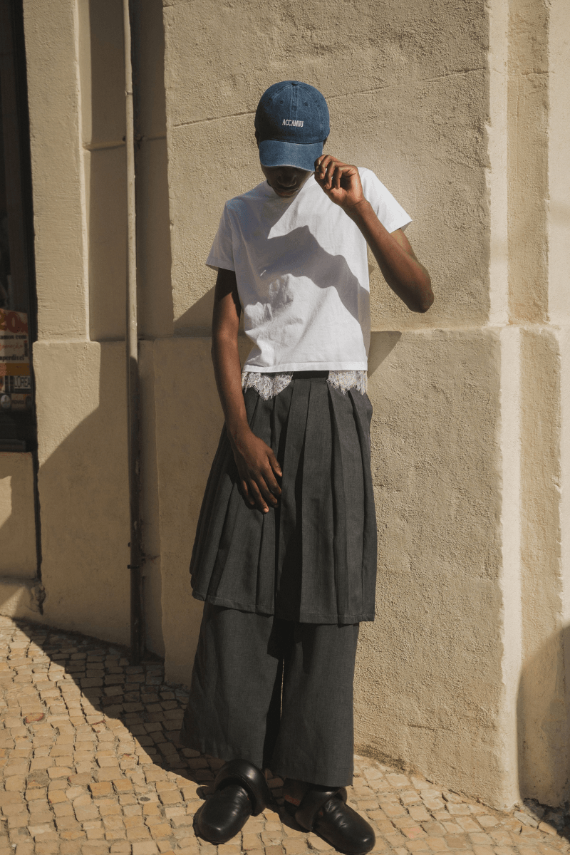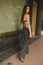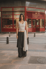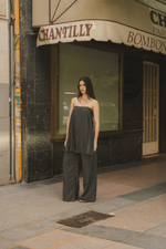 Pantalón gris tiro bajo, con caída recta desde la cadera hasta el suelo, bolsillos clásicos laterales y posteriores. El diseño cuenta con una falda plisada sobre puesta que también puedes usar como top.