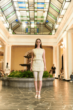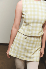 Mini falda en lino a cuadros vichy color amarillo pastel. Cintura recta con trabillas decorativas y silueta ajustada tipo línea A. Diseñada y confeccionada en Colombia.