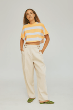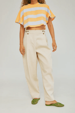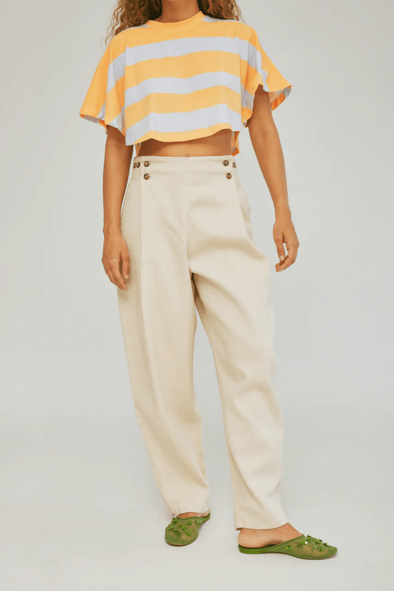 Pantalón Esquina, con su fit tipo Balloon Jeans cuenta con pliegues delanteros que se ciñen a la cintura por medio de botones, creando una horma amplia y fresca, tan cómoda y versátil para el día a día como para una ocasión especial.
