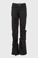 Jeans negros con cortes asimétricos y tiras para amarrar.