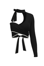 Top asimétrico de manga larga con escote en corte irregular, tiras para anudar al cuello y bajo cruzado con cintas ajustables. Detalles que definen la silueta y acentúan el diseño. Confeccionado en mezcla de poliéster y algodón, combina estructura y suavidad en una prenda audaz y versátil.