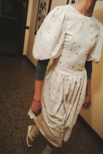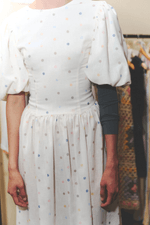 Vestido corto en lino color ivory con estampado de puntos pastel. Tiene mangas abombadas y espalda descubierta con doble lazo. Diseñado y confeccionado en Colombia.