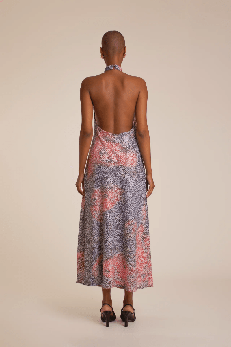Vestido largo en malla de lentejuelas con top halter que se abotona en el cuello y espalda completamente descubierta. Silueta fluida con caída recta y ligera apertura en ruedo. Sin cierres ni costuras visibles. Estampado exclusivo “RED ROSES” de Macondia.