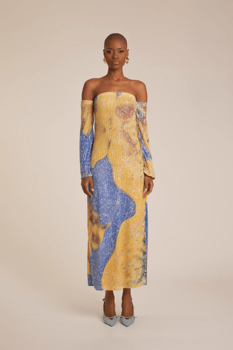 Vestido largo entallado con hombros descubiertos y mangas largas. Confeccionado en malla de lentejuelas con estampado exclusivo “YELLOW FLOWERS” de Macondia. Silueta ceñida que sigue la línea del cuerpo. Sin cierres visibles.